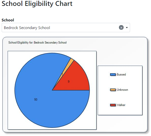 The Eligibility Chart is a pie chart which shows how many students have each eligibility type for a specific school. Once you select a school from the drop down list, a pie chart will appear displaying the number of students categorized into each eligibility type.